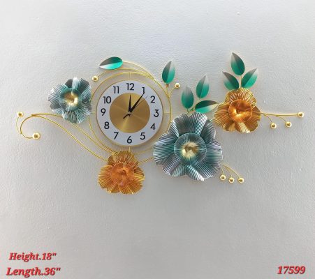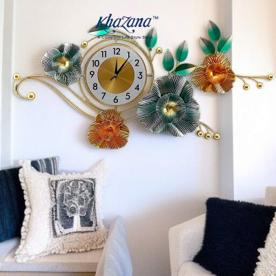 The central golden clock face, enclosed within a graceful circular frame, displays clear Arabic numerals from 1 to 12, ensuring easy and stylish time-telling. This unique design brings a touch of nature-inspired elegance and modern sophistication to any room. It serves as an impressive focal point in living rooms, dining areas, hallways, or offices, complementing various interior styles from contemporary to chic transitional.