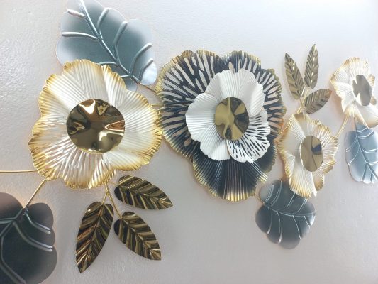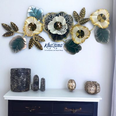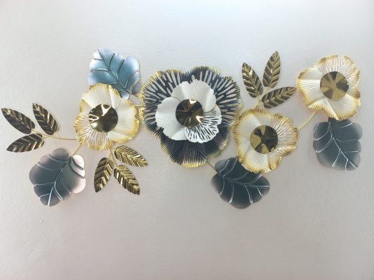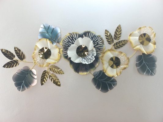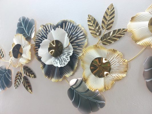 Adorn your wall with this captivating horizontal metal wall art, a sophisticated blend of natural motifs and contemporary design. This exquisite piece features a central, larger bloom with dark, textured petals and a luminous center, flanked by two smaller, elegant gold flowers with textured petals. Complementing these are gracefully arranged leaves in various metallic finishes, including sleek gold and soft grey-blue hues, some with subtle texture. The interplay of smooth and textured surfaces, along with the harmonious color palette, creates a dynamic and elegant display. Perfect for adding a touch of refined artistry and modern charm to your living room, dining area, or entryway, this piece serves as a beautiful focal point.