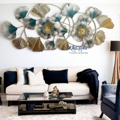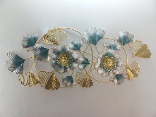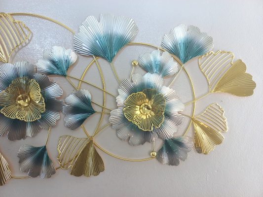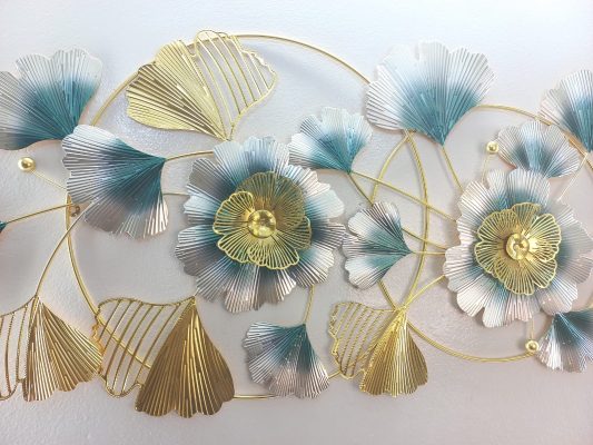 Adorn your living space with this exquisite horizontal metal wall art, a sophisticated blend of natural inspiration and modern design. This captivating piece features a harmonious arrangement of intricate ginkgo leaves and delicate floral motifs in a luxurious palette of shimmering gold and serene teal. The varying textures, from the fanned ginkgo leaves to the finely detailed flower petals, create a dynamic play of light and shadow, adding depth and visual intrigue. The flowing composition and elegant color scheme make it an ideal focal point for enhancing the ambiance of your living room, dining area, or entryway, bringing a touch of nature-inspired elegance and contemporary charm to your home.