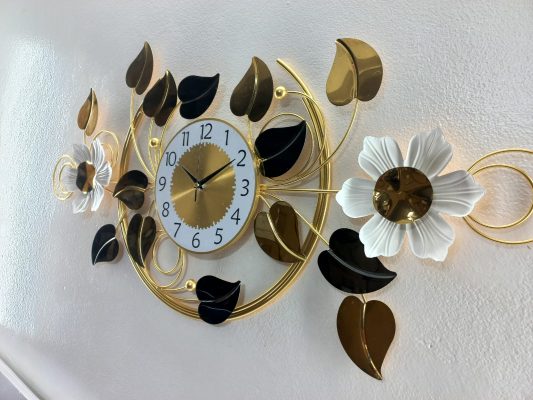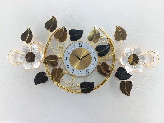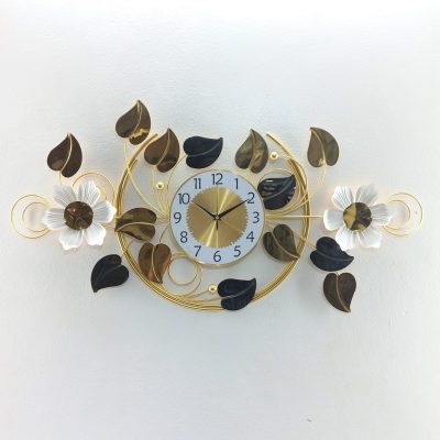 The design features a beautiful interplay of golden concentric circles, adorned with an intricate arrangement of metallic leaves in rich gold and contrasting dark bronze tones. Two prominent, beautifully detailed white and gold flowers complete the sophisticated floral motif. The central clock face, with its clear numerals and classic hands, is seamlessly integrated into this artistic framework.