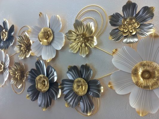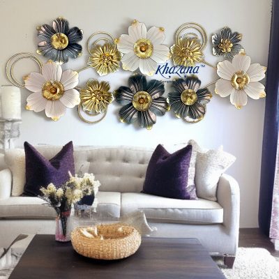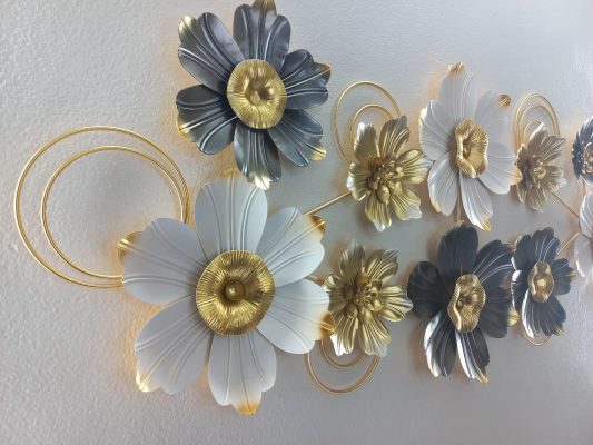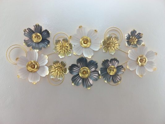 Adorn your living space with this captivating horizontal metal wall art, a sophisticated blend of various floral forms and sleek metallic accents. This stunning piece features an array of blooms in a rich palette of radiant gold, soft white, and deep grey-blue, each with a lustrous gold center. Interspersed among the flowers are elegant golden rings and smaller floral elements, adding depth and a modern touch to the composition. The interplay of colors and textures creates a dynamic and luxurious display, making it an ideal focal point for enhancing the ambiance of your living room, dining area, or entryway.