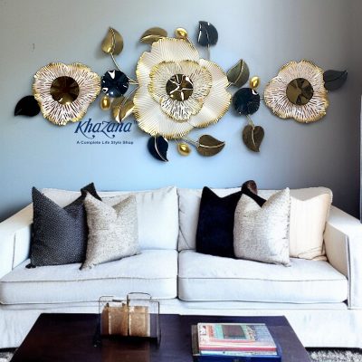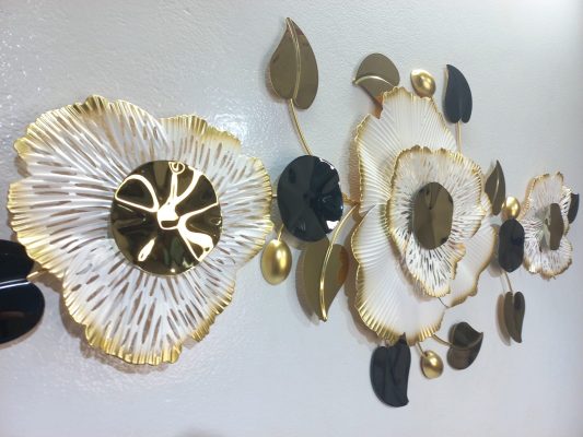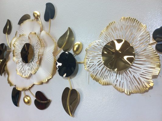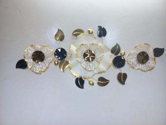 Adorn your living space with this exquisite horizontal metal wall art, a captivating composition of elegant blooms and artfully arranged leaves. This striking piece features three prominent flowers, with the central one boasting delicate white petals highlighted by opulent gold edges and a textured gold center. The flanking flowers display a rich gold finish with dark, reflective central accents. Interspersed throughout are graceful golden leaves and contrasting dark, reflective leaves, adding depth and visual intrigue. The blend of classic white, luxurious gold, and bold dark tones creates a sophisticated and balanced aesthetic, making it an ideal focal point above a sofa, console, or bed.