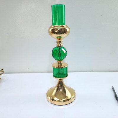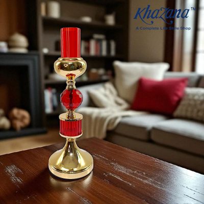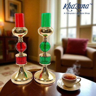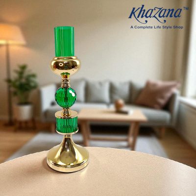 A stylish candle holder featuring a combination of polished gold and ribbed, emerald-green glass. The design consists of a golden base, a segment of green glass, a golden sphere, a faceted green glass sphere, another golden sphere, and is topped with a second segment of green glass. The entire piece is placed on a dark wooden table in a living room setting, next to a mug and a fireplace. The image is branded with the “Khazana” logo and the tagline “A Complete Life Style