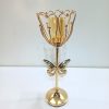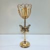A decorative golden candle holder with a whimsical design. The piece features a golden, butterfly-shaped accent on the stem, which rises from a round base. The top of the holder is shaped like a tulip flower, with graceful, curved “petals” adorned with small golden spheres. A cylindrical, amber-colored glass insert is nested within the tulip-shaped cage to hold a candle. The entire piece has a polished gold finish.