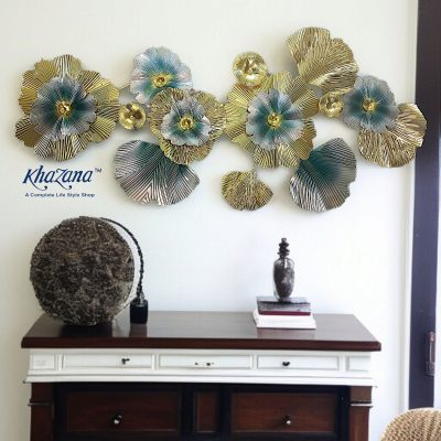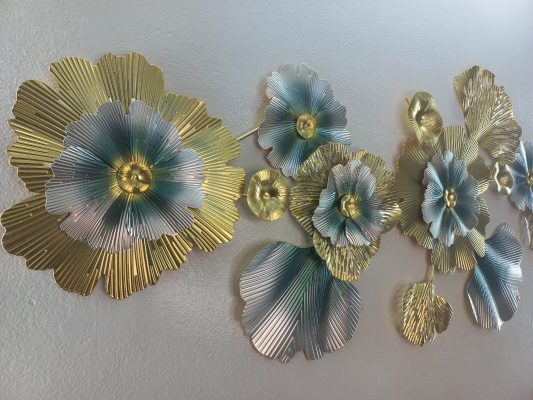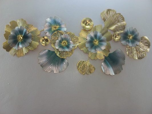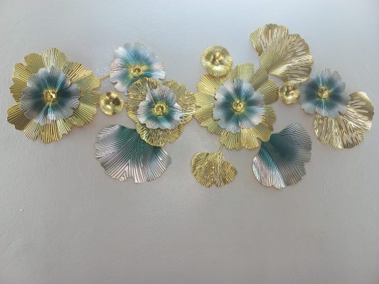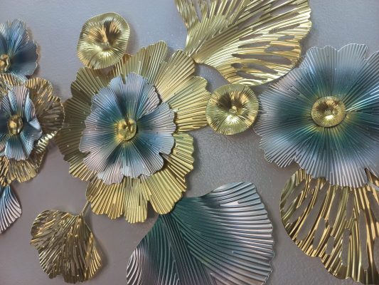 Make a striking statement with this expansive horizontal metal wall art, an artistic interpretation of blooming nature. This captivating piece showcases a dynamic arrangement of large, textured floral forms and stylized leaves in a luxurious palette of shimmering gold and serene teal. The intricate details, from the radiating textures of the petals to the varied shapes of the leaves, create a vibrant interplay of light and shadow, adding remarkable depth and visual interest. Perfect for adorning a prominent wall in your living room, dining area, or master bedroom, this art piece effortlessly combines modern abstract design with opulent metallic finishes, making it a truly mesmerizing focal point.