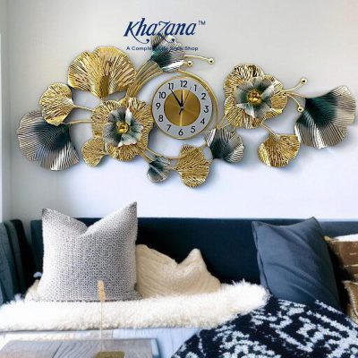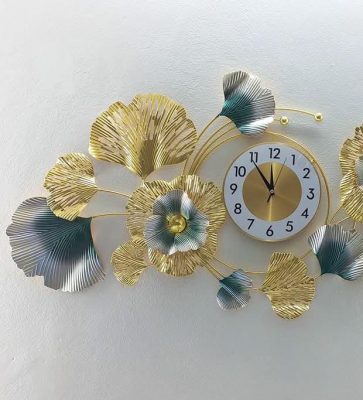 Luxurious Ginkgo & Floral Wall Clock – Gold & Teal Metallic Art