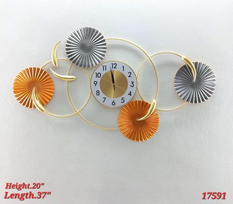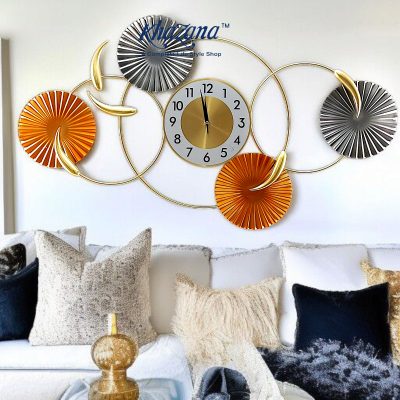 This unique decorative clock features a harmonious arrangement of textured metallic discs in striking silver and warm orange, intertwined with elegant golden rings and abstract leaf-like accents. The central golden clock face, with clear black Arabic numerals from 1 to 12, is seamlessly integrated into the artistic design, offering both functionality and a chic aesthetic. Its horizontal orientation and dynamic composition make it a perfect focal point for a living room, dining area, hallway, or office, complementing modern and eclectic interior styles.
