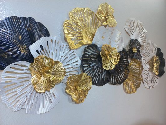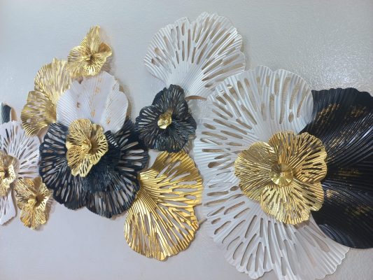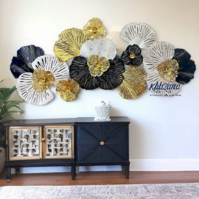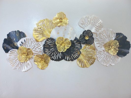 Adorn your wall with this captivating horizontal metal wall art, a bold and beautiful statement piece featuring an array of stylized blooms in a striking tri-color palette. This eye-catching artwork showcases large flowers in deep navy, crisp white, and radiant gold, each with intricate, radiating petal textures. The varying sizes and overlapping arrangement create a dynamic sense of movement and depth, making it a stunning focal point for any modern or contemporary interior. The rich color contrast and metallic sheen add a touch of drama and sophistication to your living room, dining area, or entryway.