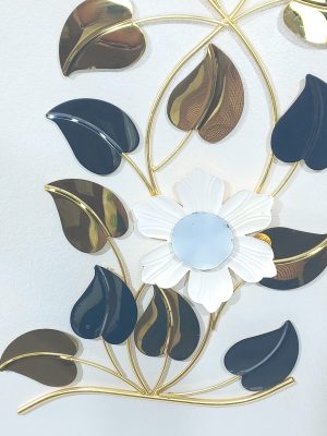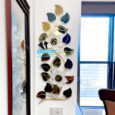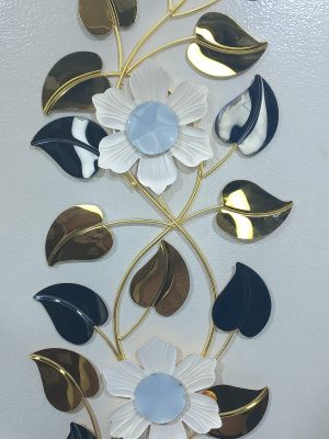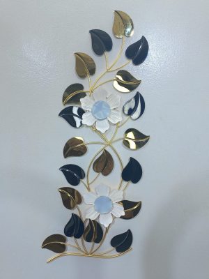 Adorn your wall with this exquisite vertical metal wall art, a stunning botanical arrangement that brings a sophisticated touch to any space. This piece features a graceful vine-like structure with two beautifully crafted white flowers, each with a contrasting dark center, serving as prominent focal points. Surrounding these blooms is an array of meticulously designed leaves in varied metallic finishes including shimmering gold, deep blue, and reflective dark bronze/teal hues. The interplay of colors and textures, along with the flowing design, creates a dynamic and elegant display. Perfect for narrow walls, entryways, or as an accent in a living room or dining area, this art piece adds both visual height and refined beauty to your home.