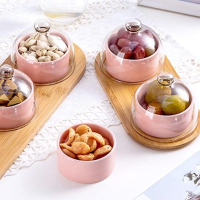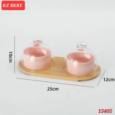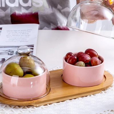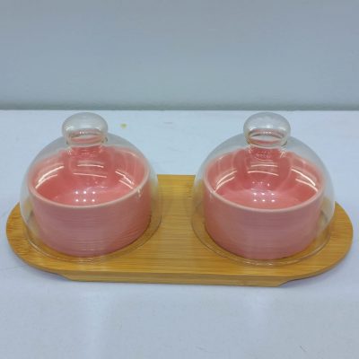 2 x Ceramic Bowl 2 x Glass Lid 2 x Wooden Tray