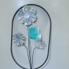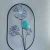 A unique and artistic wall hanging featuring three distressed grey and gold flowers, one large and two small. A prominent teal-colored leaf adds a vibrant splash of color to the composition. The flowers and leaf are connected by black stems and enclosed within a slender black oval frame, creating a modern and eye-catching design.