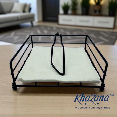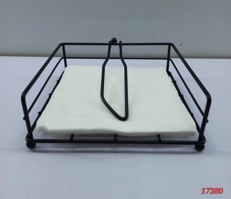 This is a modern, square-shaped napkin holder made of black metal wire. The design is simple and functional, consisting of a rectangular base and four sides made of horizontal wire bars. It holds a stack of white paper napkins, with a weighted, inverted U-shaped arm to keep the napkins in place and prevent them from being blown away or slipping out. The arm has a small decorative sphere at the top.