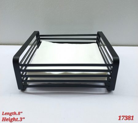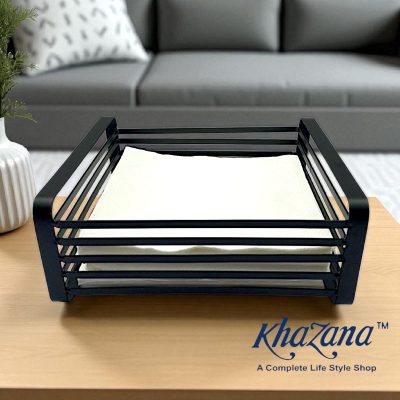 This is a minimalist and contemporary napkin holder crafted from black metal. The design is open and airy, with a solid, flat base and sides composed of evenly spaced horizontal metal bars. There are no vertical supports, giving the holder a clean, modern aesthetic. A stack of white paper napkins is shown resting inside the holder.