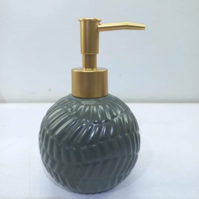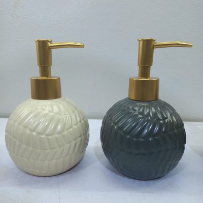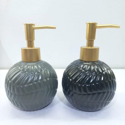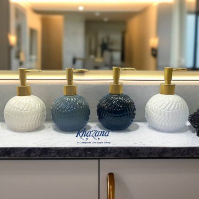 A set of four elegant, spherical ceramic soap or lotion dispensers arranged on a bathroom counter. Each dispenser features a textured, ribbed, or leafy pattern and is topped with a polished gold-colored pump mechanism and spout.