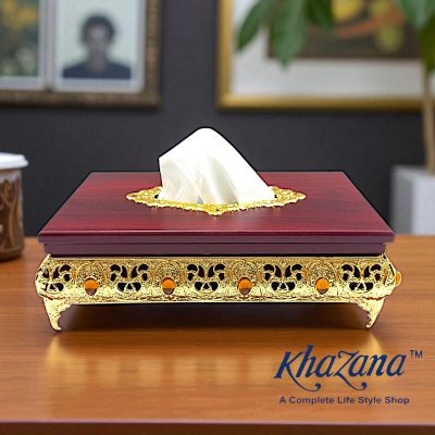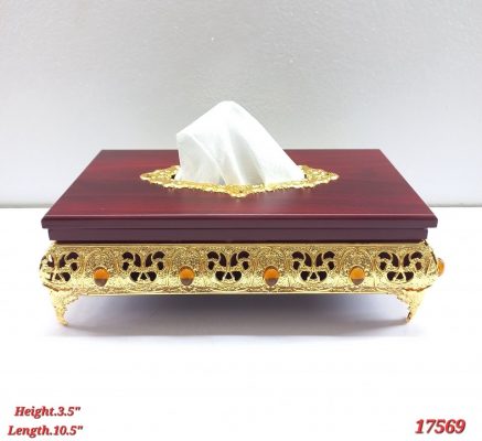 This is a decorative tissue box cover featuring a rich, dark wood grain finish on the top and a highly ornate, antique gold-colored base. The base has a detailed filigree design with several amber-colored faux gems set into the metalwork. The legs are also a part of the intricate gold design, giving the box an elevated and elegant look. The opening for the tissues is bordered with a matching gold, floral-inspired trim. A white tissue is shown protruding from the top opening. Height.3.5″” and “Length.10.5″”, are indicated in red text on the image. A product number, “17569”