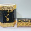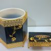 This is a two-piece bathroom accessory set featuring a hexagonal dustbin and a rectangular tissue box. Both pieces are made of a black material with a marble-like pattern, and are adorned with intricate gold-colored metal accents. The set showcases a luxurious and classic aesthetic, combining a black marble pattern with ornate gold metalwork. A raised floral motif in gold is featured on both the dustbin and the tissue box, adding a touch of elegance.