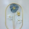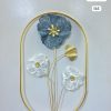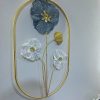 This exquisite metal wall sculpture is a celebration of floral beauty and modern design. It showcases a gracefully arranged bouquet featuring a large, textured blue blossom as the centerpiece, complemented by two delicate white flowers and a single golden leaf. The slender golden stems create an elegant flow, all contained within a sleek, oblong golden frame. The 3D construction adds depth and character, making it a stunning focal point in any room.