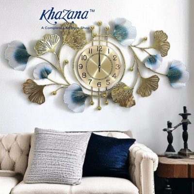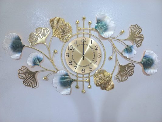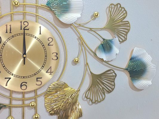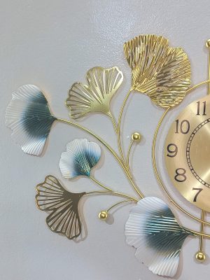 Adorn your wall with this exquisite metallic wall clock, featuring a graceful horizontal design inspired by the unique ginkgo leaf. This captivating timepiece showcases a mix of golden ginkgo leaves and beautiful white leaves with subtle blue/green accents, intricately arranged around a classic gold-toned clock face. Delicate golden spheres add an extra touch of sophistication. Perfect as a striking focal point above a sofa, console table, or in a spacious entryway, this clock combines artistic elegance with practical timekeeping.