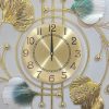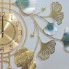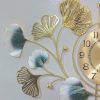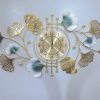 Adorn your wall with this exquisite metallic wall clock, featuring a graceful horizontal design inspired by the unique ginkgo leaf. This captivating timepiece showcases a mix of golden ginkgo leaves and beautiful white leaves with subtle blue/green accents, intricately arranged around a classic gold-toned clock face. Delicate golden spheres add an extra touch of sophistication. Perfect as a striking focal point above a sofa, console table, or in a spacious entryway, this clock combines artistic elegance with practical timekeeping.