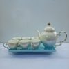Indulge in the timeless tradition of tea with this exquisite porcelain tea set. Featuring a lustrous pearlescent finish and delicate silver-toned accents, this set brings a touch of sophistication to any occasion. The complete service for six includes a gracefully shaped teapot, six matching cups, and a stylish footed tray, making it perfect for hosting guests or enjoying a quiet, elegant moment alone. A beautiful addition to any home and a thoughtful gift for any tea lover.Discover this and more at Khazana – A Complete Life Style Shop.