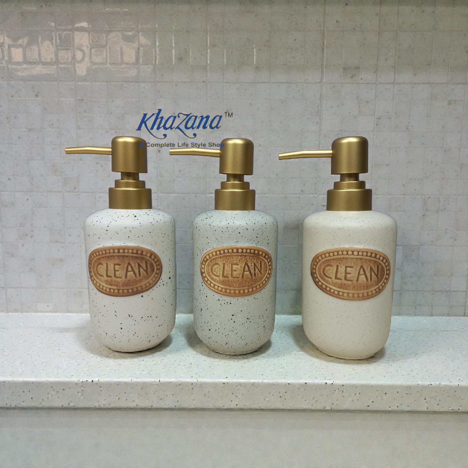 elegant speckled ceramic soap dispenser with gold pump