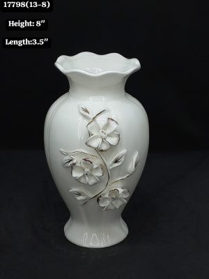 The most striking feature is the raised, three-dimensional floral and vine design that wraps around the center of the vase. The delicate flowers and leaves are accented with a sophisticated gold trim, adding a touch of luxury and highlighting the sculptural craftsmanship. The glossy white finish gives it a clean, timeless appeal.