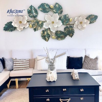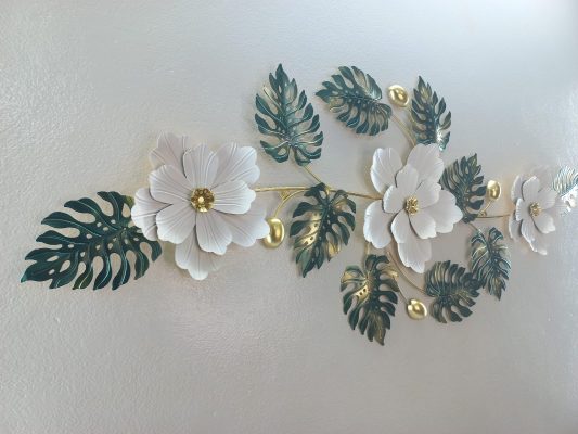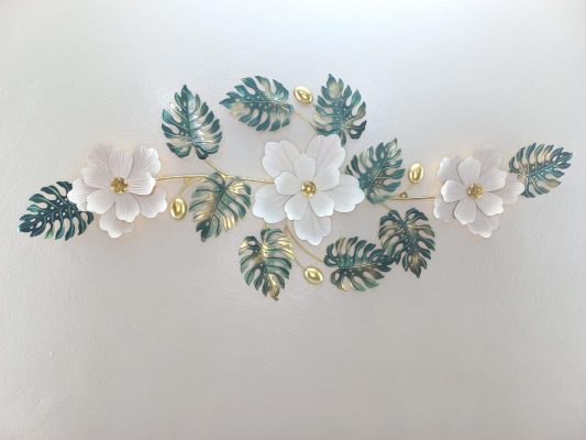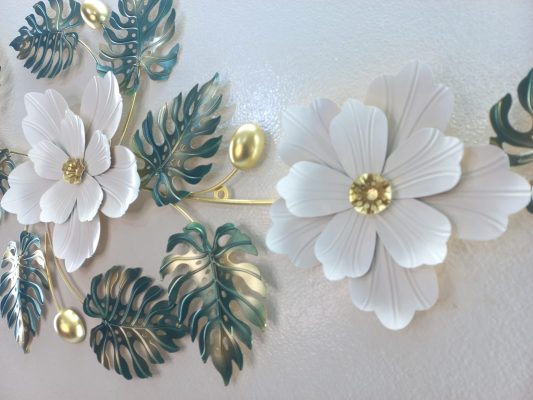 Adorn your living space with this exquisite horizontal metal wall art, a beautiful fusion of delicate blooms and rich foliage. This captivating piece features three prominent white flowers, each with a subtle gold center, gracefully arranged along a golden vine-like structure. Surrounding the flowers are an array of meticulously crafted leaves in a luxurious blend of gold and textured teal, creating a dynamic interplay of colors and textures. The sophisticated design and harmonious palette make it an ideal focal point for adding a touch of nature-inspired elegance and contemporary charm to your living room, dining area, or entryway.