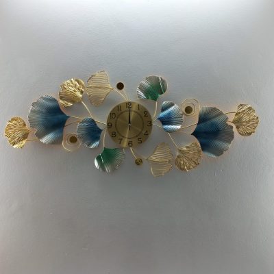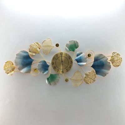 This magnificent horizontal timepiece features a sprawling arrangement of beautifully crafted metallic leaves. It showcases a luxurious blend of radiant golden ginkgo leaves and larger, textured leaves in captivating iridescent blue and subtle green tones, creating a rich and dynamic visual appeal. Delicate golden tendrils and abstract circular accents, some with sparkling crystal-like details, are intricately woven throughout the design. The central golden clock face, with clear black Arabic numerals from 1 to 12, is seamlessly integrated into this vast artistic composition, ensuring both easy readability and a stunning aesthetic. Its impressive length makes it an ideal focal point for large living room walls, above sofas, in dining areas, or grand entryways, adding a touch of sophisticated natural elegance and modern grandeur.