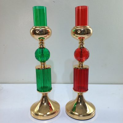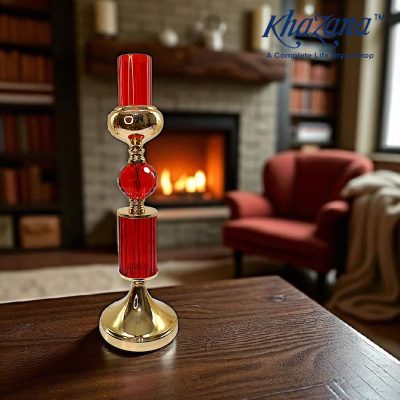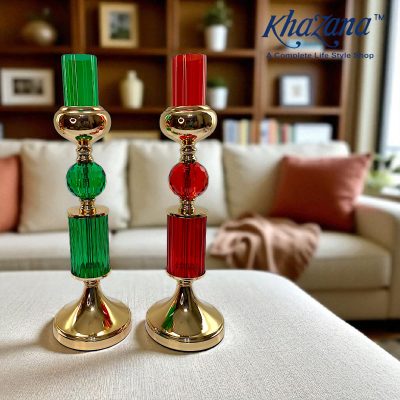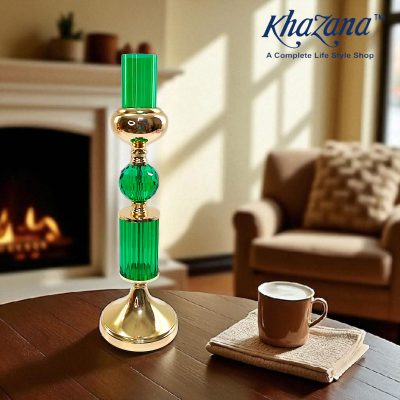 A stylish candle holder featuring a combination of polished gold and ribbed, emerald-green glass. The design consists of a golden base, a segment of green glass, a golden sphere, a faceted green glass sphere, another golden sphere, and is topped with a second segment of green glass. The entire piece is placed on a dark wooden table in a living room setting, next to a mug and a fireplace. The image is branded with the “Khazana” logo and the tagline “A Complete Life Style