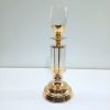 A single, elegant candle holder with a polished golden finish and a clear glass component. The design features a round, golden base supporting a central stem. The stem is composed of a golden sphere, a cylindrical segment of ribbed clear glass, and another golden sphere. The top holds a clear, goblet-shaped glass cup, which is currently filled with a liquid.