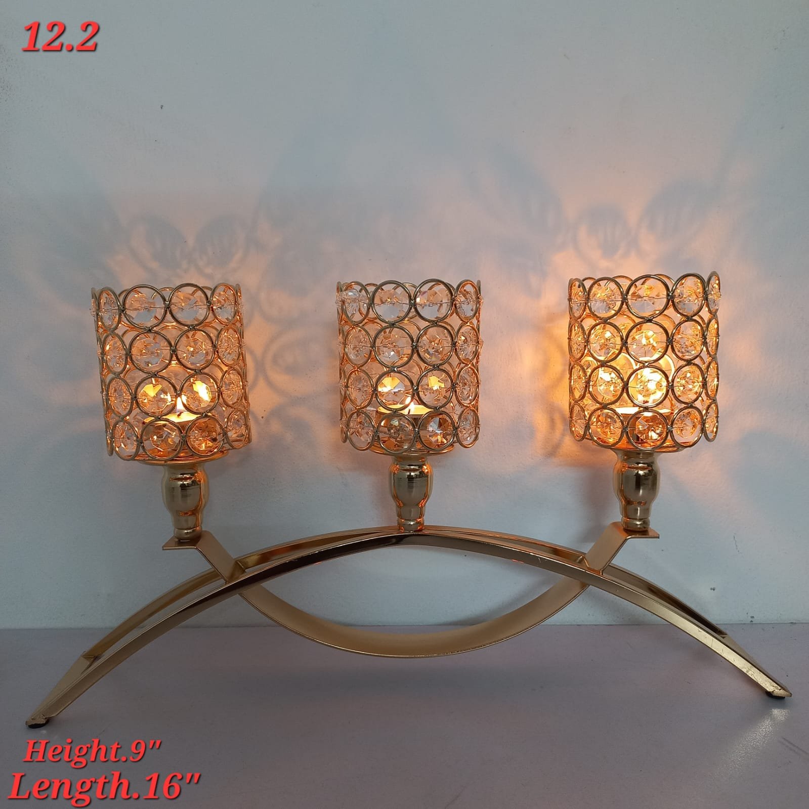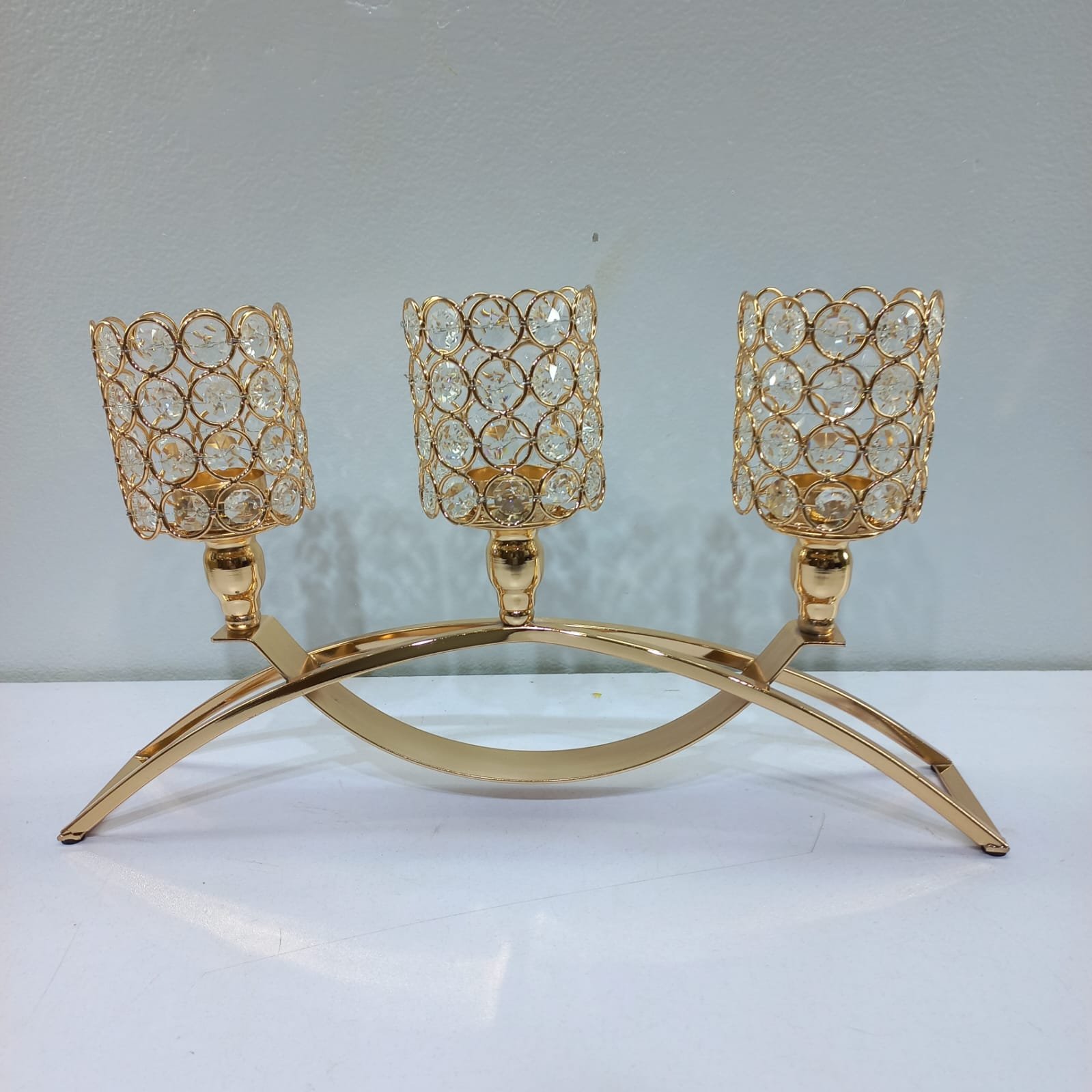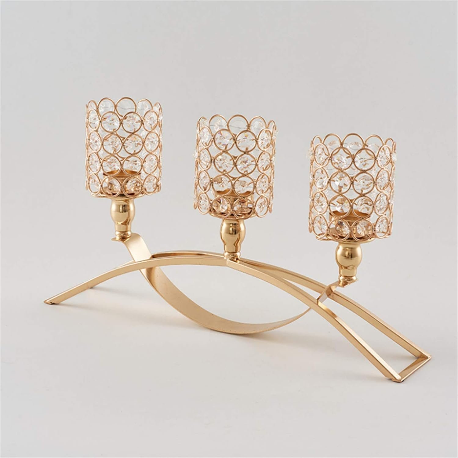 Elevate your home’s ambiance with this stunning 3-cup crystal candelabra. Designed with a sophisticated modern flair, this piece features a sleek, golden-finished arched base that supports three intricately crafted cylindrical candle holders. Each cup is adorned with shimmering faceted crystals set in a delicate metal lattice, creating a brilliant light-refracting effect when paired with tea lights or small votive candles.