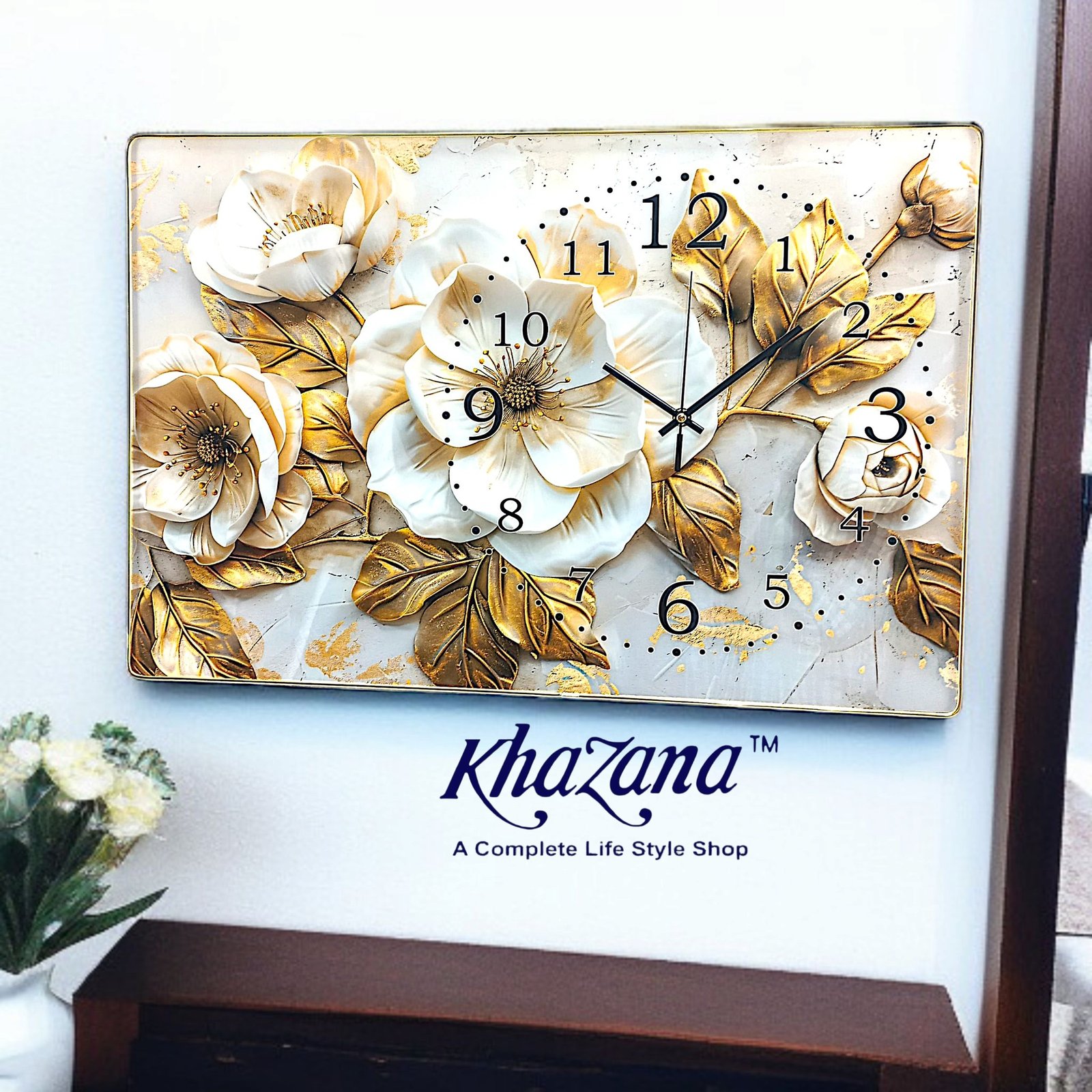 Elevate your home aesthetics with this stunning rectangular wall clock that doubles as a piece of fine art. Featuring a high-definition 3D textured floral design, this clock showcases elegant white blossoms accented by rich gold-leafed foliage. The minimalist clock face uses classic Arabic numerals and a sleek three-hand movement, set against a marbled background with gold-flecked detailing. Encased in a slim golden frame, it is the perfect horizontal focal point for any contemporary living room or hallway.