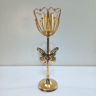 A decorative golden candle holder with a whimsical design. The piece features a golden, butterfly-shaped accent on the stem, which rises from a round base. The top of the holder is shaped like a tulip flower, with graceful, curved “petals” adorned with small golden spheres. A cylindrical, amber-colored glass insert is nested within the tulip-shaped cage to hold a candle. The entire piece has a polished gold finish.