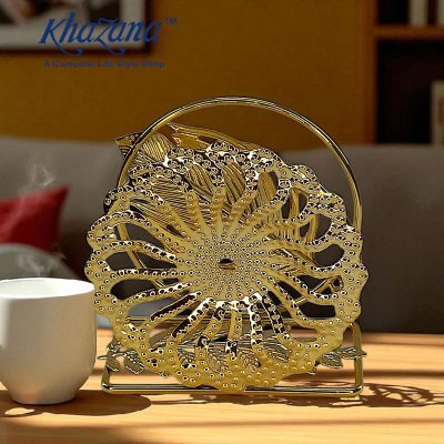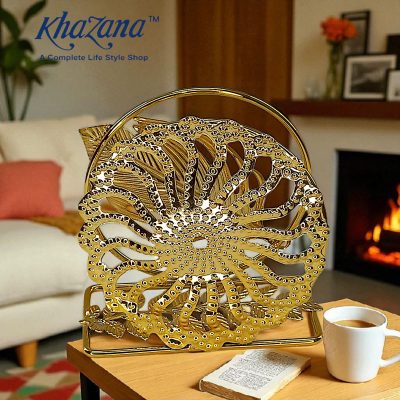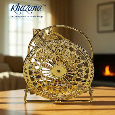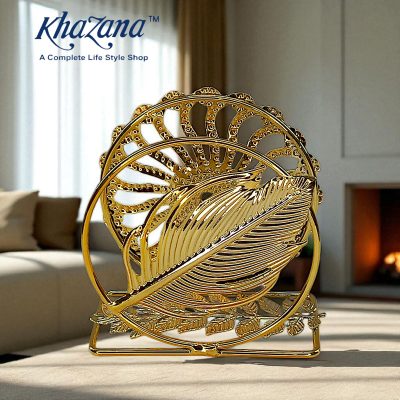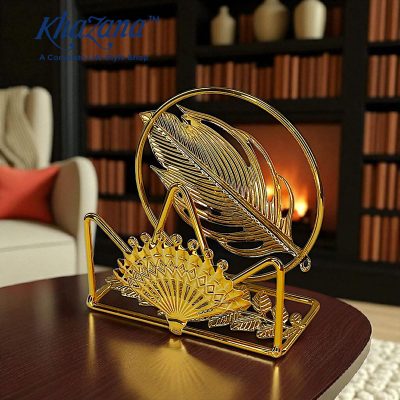 This is a unique and stylish golden napkin holder with a feather and fan motif. The design features a prominent, large feather in the center, encircled by a ring, while a detailed fan-like pattern with geometric elements adorns the base. The holder has a distinct and modern aesthetic, supported by a minimalistic, geometric frame. It is placed on a dark wooden table in a sophisticated room, with a blurred background of a bookshelf and what appears to be a fireplace, suggesting a cozy and elegant setting. The brand “Khazana” is visible in the top left corner.