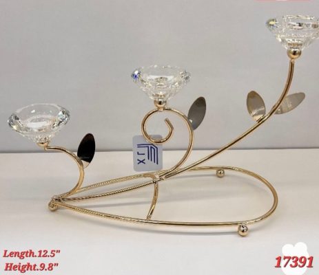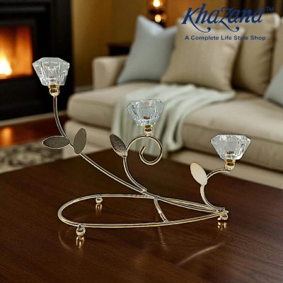 A modern, sculptural candelabra with a polished golden finish and a flowing, organic design. The piece features a base made of intertwined golden wire and holds three diamond-shaped crystal light holders on slender stems. The stems are adorned with delicate golden leaf accents.