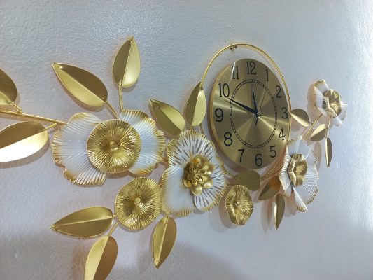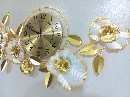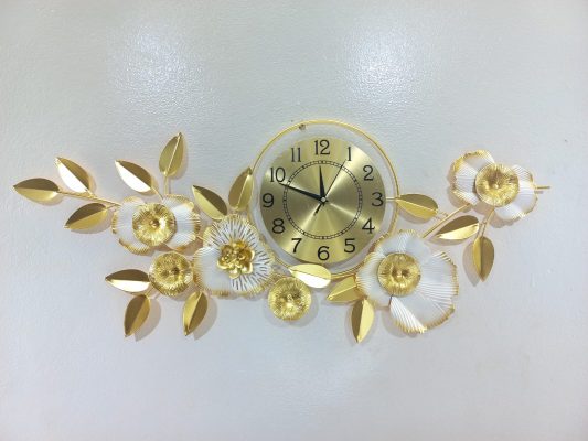 Description: Adorn your living space with this radiant metallic wall clock, designed with a captivating horizontal arrangement of golden flowers and leaves. This elegant timepiece features beautiful layered flowers with textured white and golden petals, surrounded by lustrous golden leaves and delicate accents, all framing a classic gold-toned clock face. The bold black numerals and golden hands ensure clear readability. Perfect as a striking centerpiece above a sofa, console table, or in a dining area, adding a touch of opulent charm and timeless appeal to your home decor.