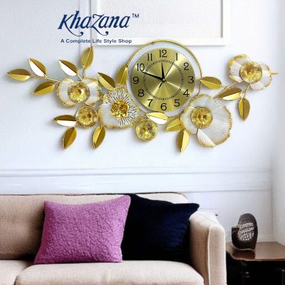 Title: Golden Floral Elegance Metallic Wall Clock – 37″ Length | Khazana Lifestyle (Code: 17679)