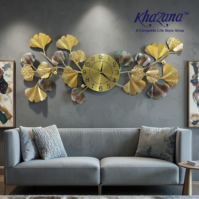 This exquisite horizontal wall clock blends functional design with nature-inspired artistry. Featuring a sprawling branch of metallic ginkgo leaves, it serves as an elegant statement piece for modern and contemporary interiors.