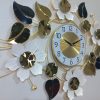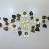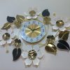 - Color Palette: Gold frame, white and dark accented flowers with reflective centers, dark leaves, light blue clock face with gold hands