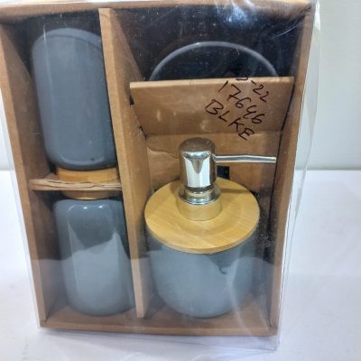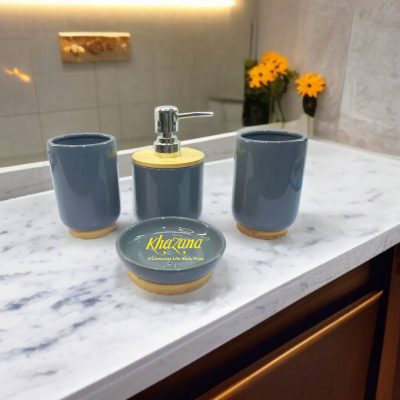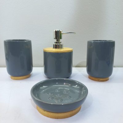 This is a four-piece bathroom accessory set featuring a sleek grey ceramic design with warm bamboo accents. The set includes a soap dispenser with a chrome pump, two tumbler cups, and a soap dish. The pieces are smooth and have a clean, modern aesthetic. The bamboo bases add a natural and stylish contrast to the grey ceramic.