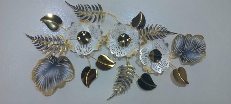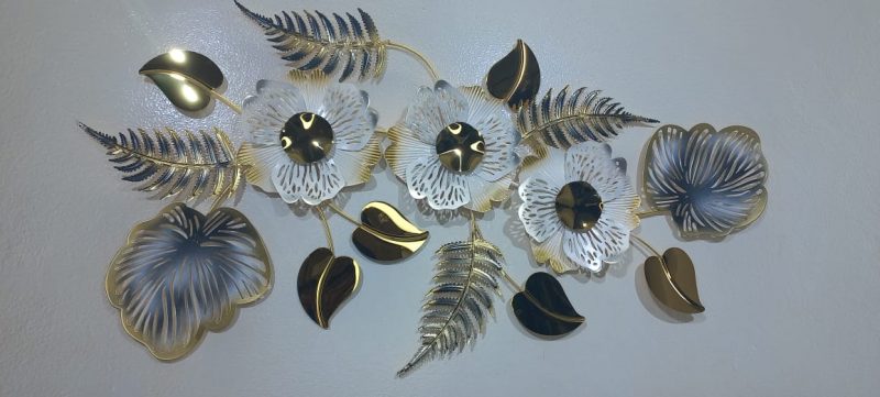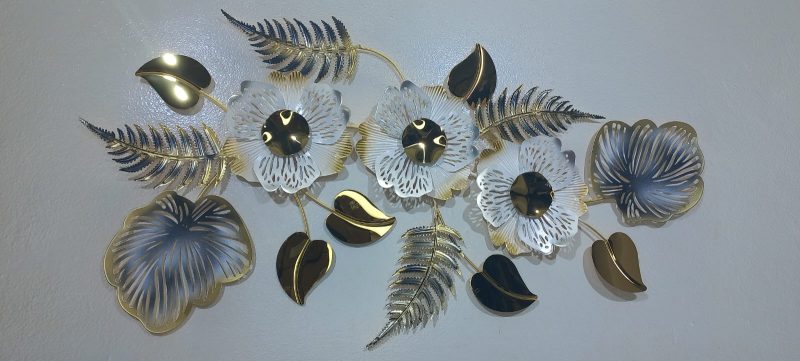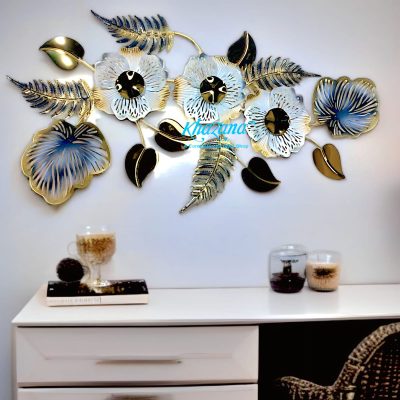 Adorn your walls with this captivating metal art piece, showcasing a graceful arrangement of delicate flowers and intricate leaves. The exquisite blend of shimmering gold and serene blue hues creates a sophisticated and calming presence, perfect for enhancing any contemporary or classic interior. Each element is meticulously crafted to add depth and dimension, making it a beautiful focal point for your home or office.