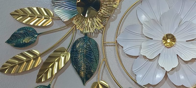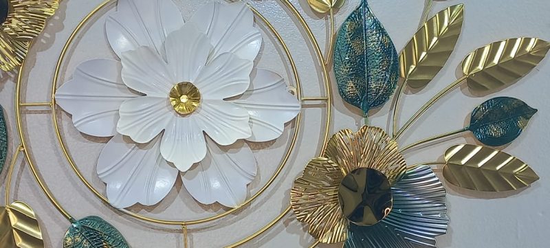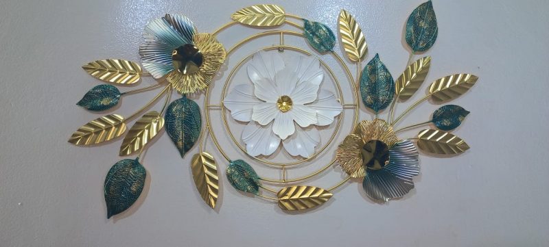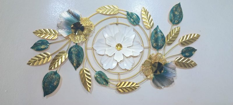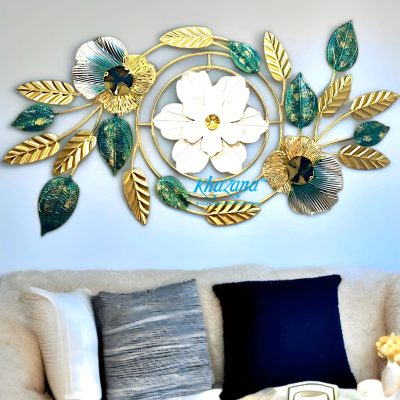 Adorn your living space with this captivating metal wall art, a harmonious blend of intricate design and luxurious color. This horizontal piece features a central circular medallion housing a pristine white flower with a sparkling crystal accent, beautifully framed by delicate gold branches. Flanking the medallion are elegant gold and teal-hued flowers, their centers adorned with deep, reflective accents, and surrounded by an array of shimmering gold and textured teal leaves. The interplay of smooth and textured metallic finishes, combined with the vibrant color palette, creates a stunning visual statement that adds sophistication and charm to any contemporary or classic interior. Ideal for placement above a sofa, console, or bed, this art piece is sure to be a focal point in your home.