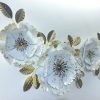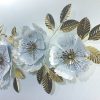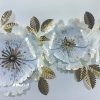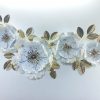Enhance your living space with this beautiful and elegant metal wall sculpture. This large art piece features a stunning arrangement of four oversized, three-dimensional flowers in a distressed white finish, highlighted with delicate gold accents for a touch of vintage glamour. The intricate dark centers of the flowers provide a striking contrast, while clusters of pale blue-grey leaves add a soft, calming touch to the overall design.