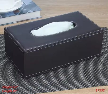 This elegant and functional tissue box holder is the perfect addition to any home or office decor. Crafted from high-quality dark brown leather, it features a classic rectangular shape and is accented with eye-catching white stitching along the edges. The design provides a sophisticated way to conceal standard tissue boxes.