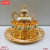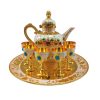 Accompanying the teapot are six elegant pedestal cups, each boasting a golden interior and a pristine white exterior. These cups are further embellished with delicate golden patterns and a striking blue-green gemstone, elevating their aesthetic appeal. The entire ensemble is presented on a lavish round serving tray, gleaming in gold with ornate embossed patterns, completing this truly regal collection.