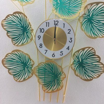 Metal Body Golden, Green Color Leaf Design Decorative Wall Clock