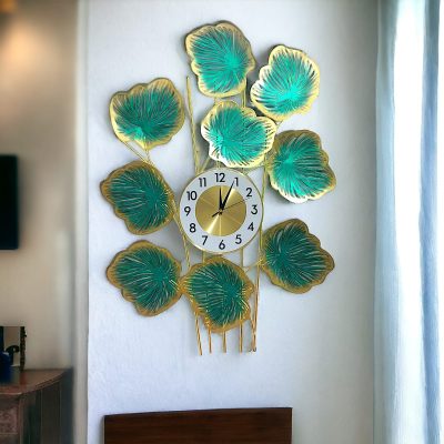 Metal Body Golden, Green Color Leaf Design Decorative Wall Clock