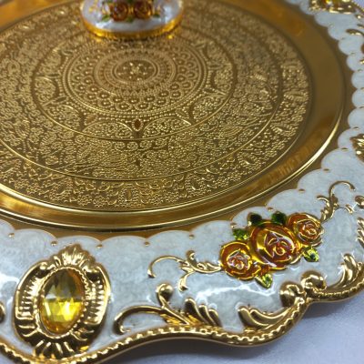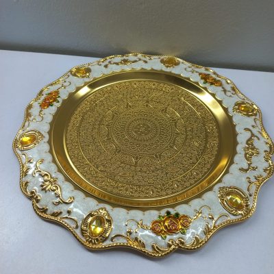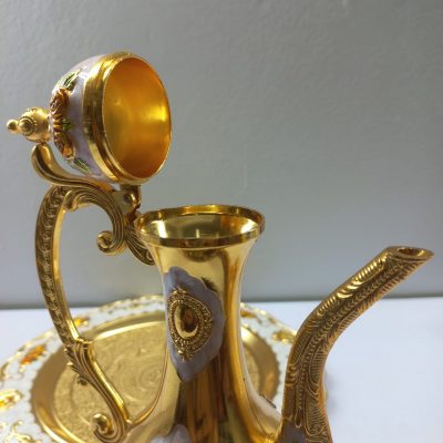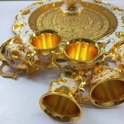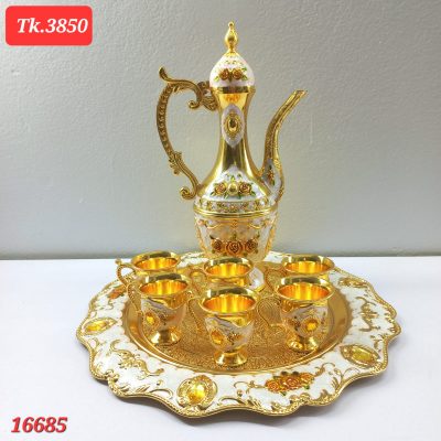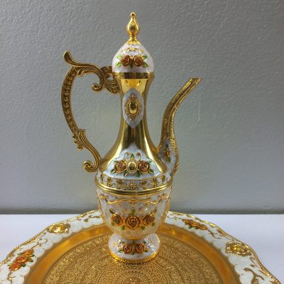 This is a beautiful and ornate Arabic coffee set, likely used for serving traditional coffee. The set includes a large, elegant dallah (coffee pot) and six small, matching finjan (cups), all resting on a decorative tray. The entire set is made of a material with a lustrous gold finish, accented with intricate floral patterns in white, orange, and gold. The dallah features a tall, slender design with a long, curved spout and a decorative handle. The cups have a similar floral motif. The tray is round with a scalloped edge and is also decorated with a floral design and what appear to be amber-colored gem-like embellishments. The overall aesthetic is one of luxury and traditional elegance. The image also shows a logo for “Khazana” which is described as a “Complete Life Style Shop.”