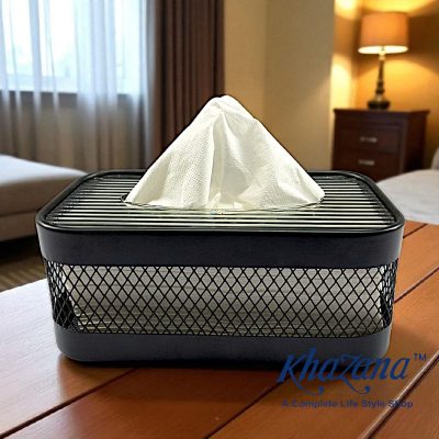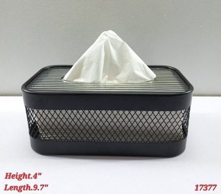 This is a contemporary tissue box cover made of black metal. The design features a lower section with a diamond-patterned mesh screen, giving it a light, see-through aesthetic. The top part is a solid, rectangular frame with parallel, horizontal metal bars that form the surface. The center of the top has an oval-shaped opening for tissue dispensing. A white tissue is shown protruding from the opening.