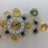 This striking timepiece features an artistic arrangement of concentric golden circles from which metallic petals gracefully emerge. These petals showcase a beautiful interplay of radiant gold, sleek silver, and subtle hints of teal, creating a dynamic and sophisticated visual appeal. The central golden clock face, with clear black Arabic numerals from 1 to 12, is seamlessly integrated into this vibrant composition, ensuring both easy readability and a delightful aesthetic. Its horizontal orientation and lively design make it an ideal focal point for a living room, dining area, hallway, or office, perfectly complementing modern, glamorous, and chic transitional interior styles.